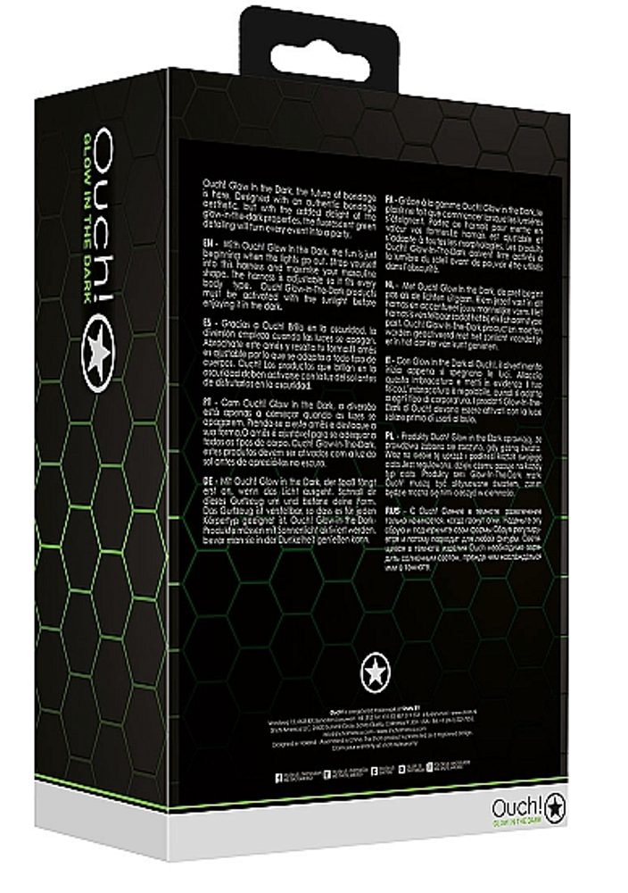 Glow in the Dark, budoucnost otroctví od Ouch! je tady. Navrženo s autentickou estetikou bondage, ale s přidaným potěšením z vlastností svítících ve tmě, fluorescenční zelené detaily promění každou událost v záři ve tmě, zábava tak teprve začíná, když zhasnou světla.