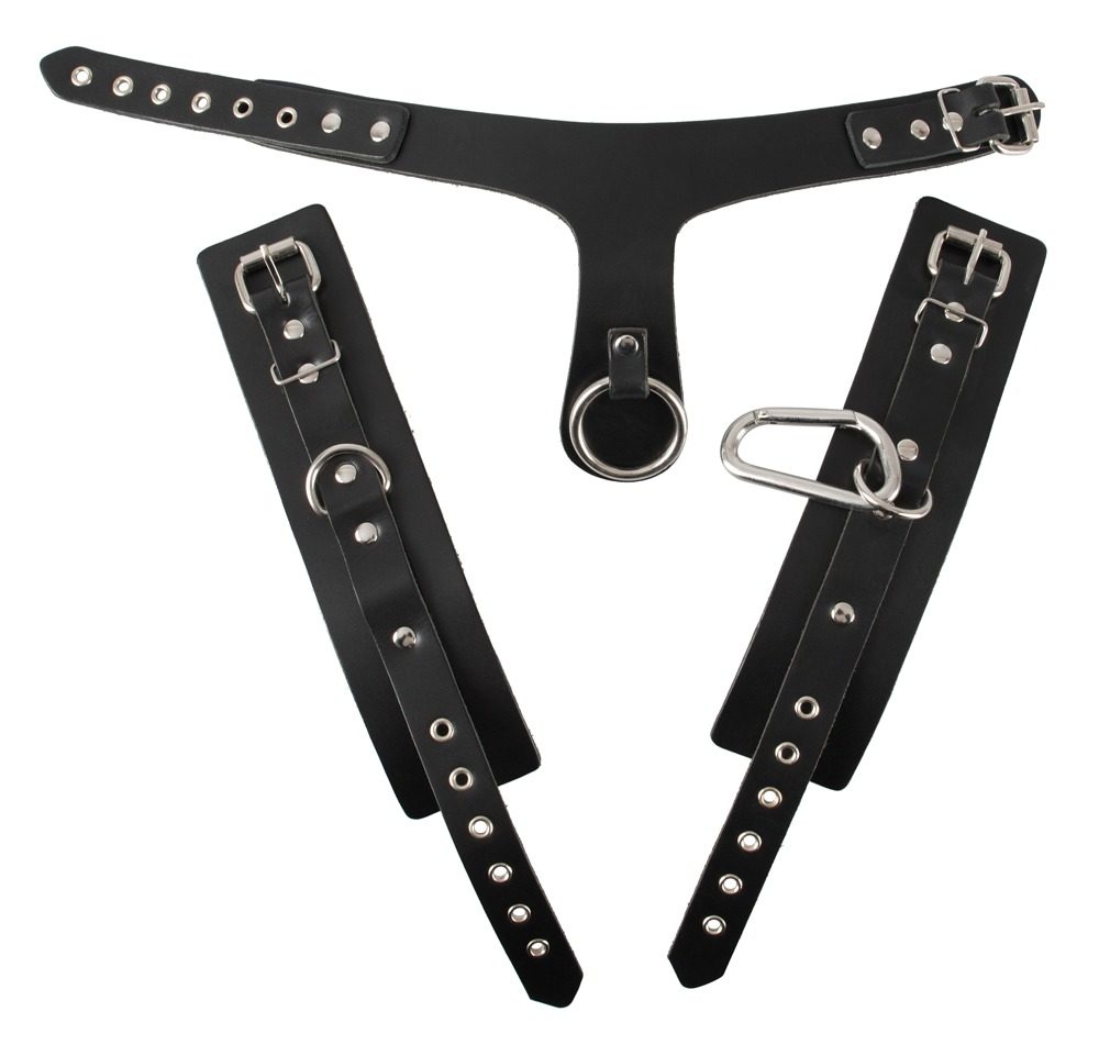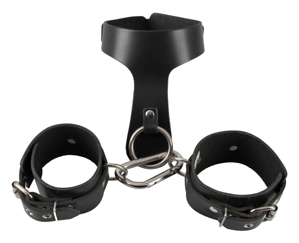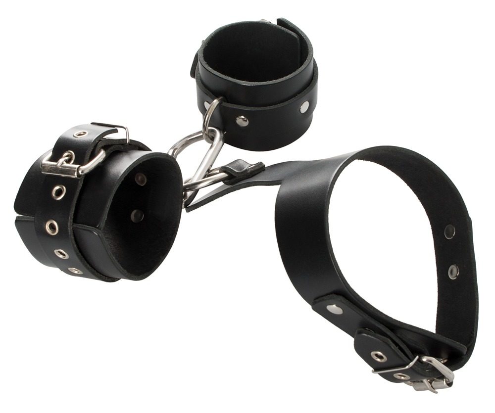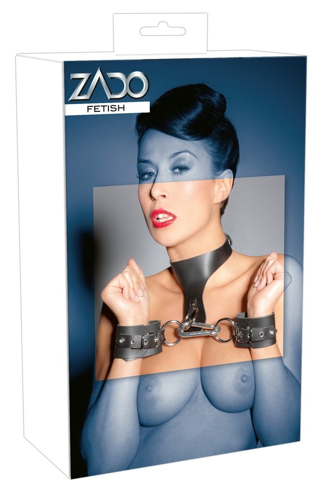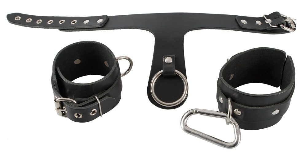 Balení obsahuje obojek s kroužkem a 2 nevycpanými pouty na velké a jednoduché karabině. Dále pak nastavitelná pouta. Vše z pravé kůže (buvol) a kovu.