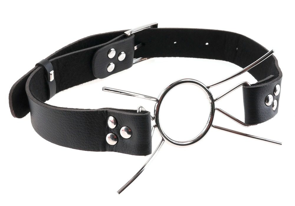Spider gag s ocelovým kroužkem a 4 „nohami“- Leštěný ocelový kroužek s průměrem 3,8 cm- Čtyři pevné zahnuté „nohy“ udrží ústa otevřená- Nastavitelný vinylový pás s přezkou pro perfektní usazení