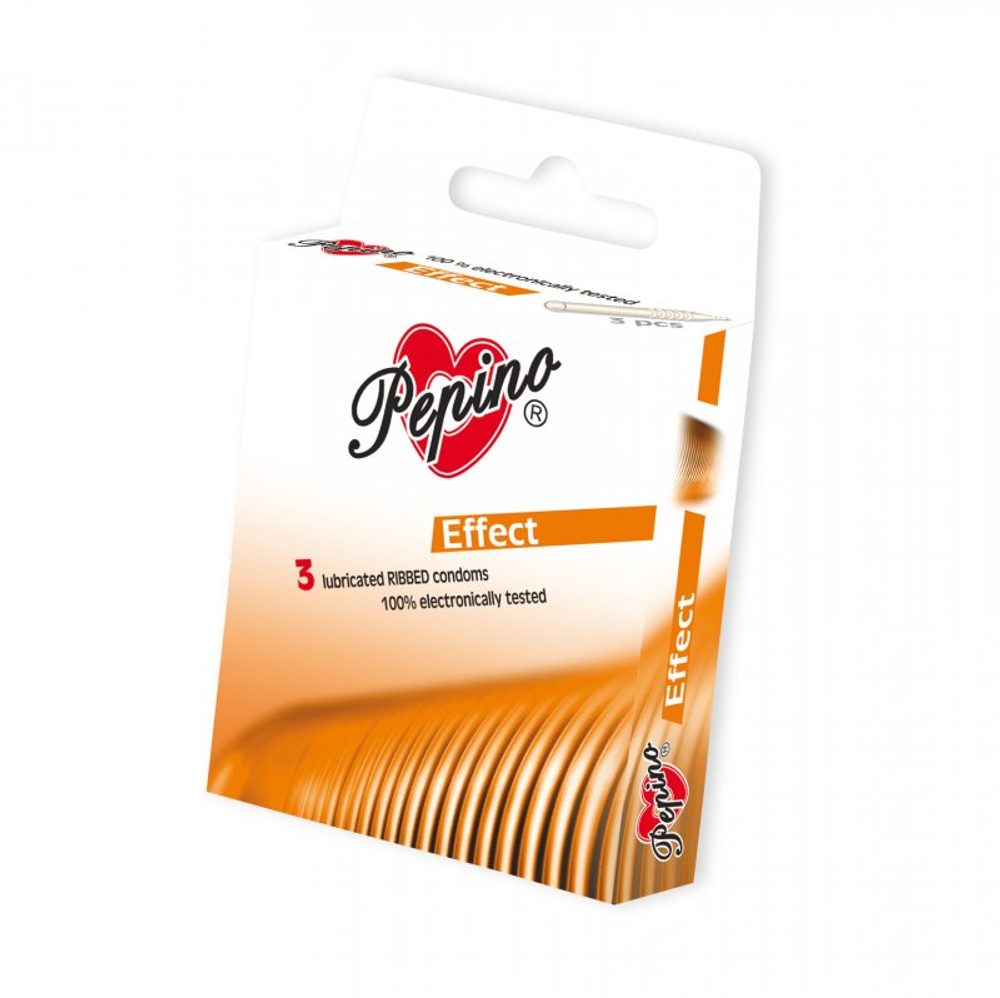 Balení obsahuje 3ks kondomů. Pepíno Effect jsou kondomy z přírodního latexového materiálu. Povrch kondomů je zvrásněn pro větší dráždivý účinek. Kondomy jsou lubrikovány lubrikačním gelem na silikonové bázi a jsou 100% elektronicky testovány. Šířka 53 mm.