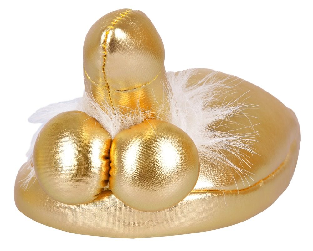 Zlaté pantofle z měkkého materiálu s penisem a varlaty na špičce každého pantofle…
