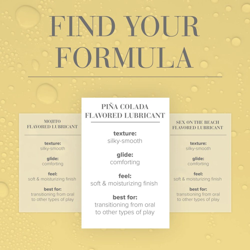 JO Pina Colada Flavored Lube spojuje zábavu pro dospělé s lahodnými chutěmi. Tento lubrikant inspirovaný koktejly na vodní bázi obsahuje směs šťavnatého ananasu a kokosu. Nabízí smyslné a uklidňující klouzání s hedvábně hladkým pocitem, což je ideální pro jakýkoli intimní moment, zejména při přechodu z orálního potěšení na jiné aktivity. Po použití se snadno smývá a zanechává pokožku jemnou a hydratovanou.